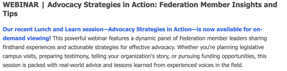 The Network Exchange Hub is a members-only Dropbox space curated by the Federation to support peer-to-peer sharing across the network. It houses compiled, searchable resources developed from member input, including colleague question responses, agency policies, sample job descriptions, templates, and other practical tools. The Hub is designed to support informed decision-making, enhance operational efficiency, and promote peer-informed learning among member agencies.